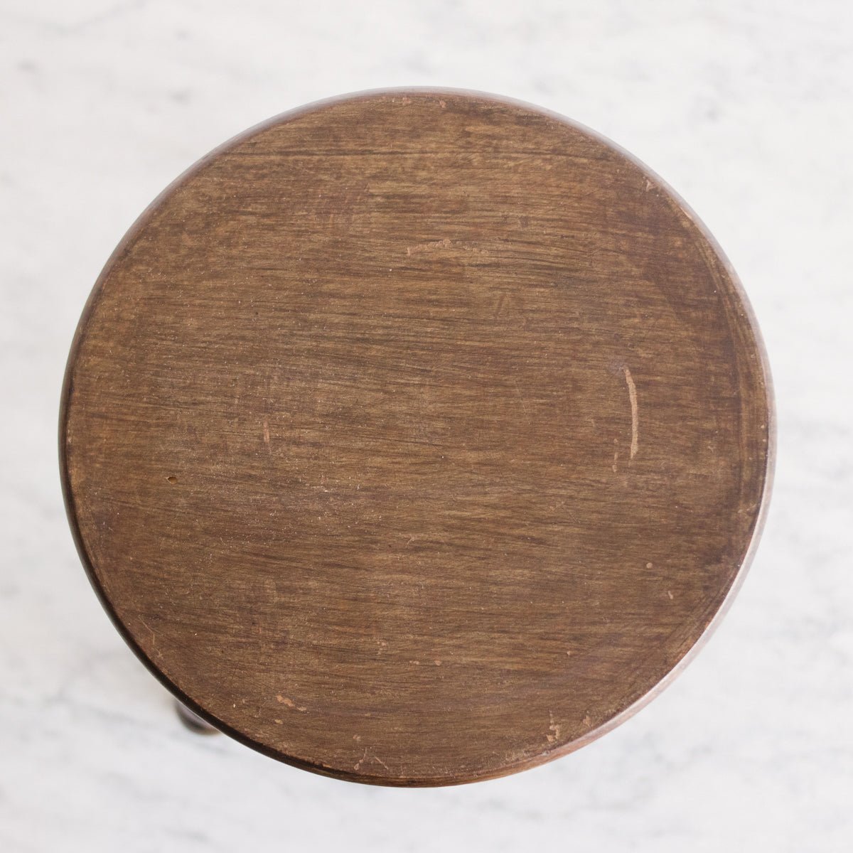 Authentic vintage tripod stool sourced from a flea market in Béziers, France. Crafted from solid wood with a rich stained and sealed finish that showcases the natural grain and patina of age. The distinctive twisted legs provide both structural integrity and visual character—a hallmark of mid-century design. Ideal as a functional accent piece, plant stand, or side table that brings genuine vintage charm and European provenance to any interior.