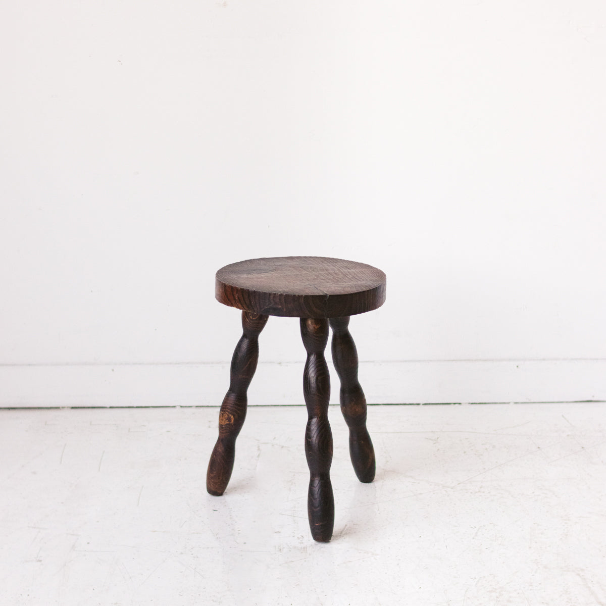 Authentic vintage spindle stool sourced from a St. Etienne flea market. Crafted from solid pine with a rich stained finish that showcases the wood's natural grain and patina. The turned spindle design reflects mid-century European craftsmanship, making it a versatile accent piece for seating, plant display, or side table use. Genuine vintage condition with character marks that speak to its provenance and age.