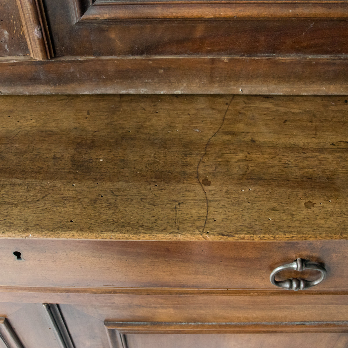 Discovered at a flea market in Avignon, this two-piece walnut china cabinet exemplifies mid-century European craftsmanship. The base features paneled doors with lock-and-key closure, one fixed shelf, and a generous drawer for linens or serveware. Above, the glass-fronted upper cabinet displays treasured pieces across three adjustable shelves (1" increments). Hand-oiled walnut finish develops character with age. A substantial, authentic addition to curated interiors.