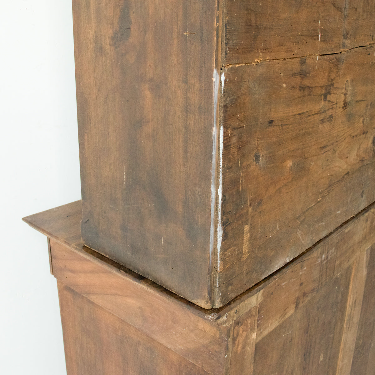- Constructed in two pieces: base cabinet with paneled doors and upper cabinet with glass doors.