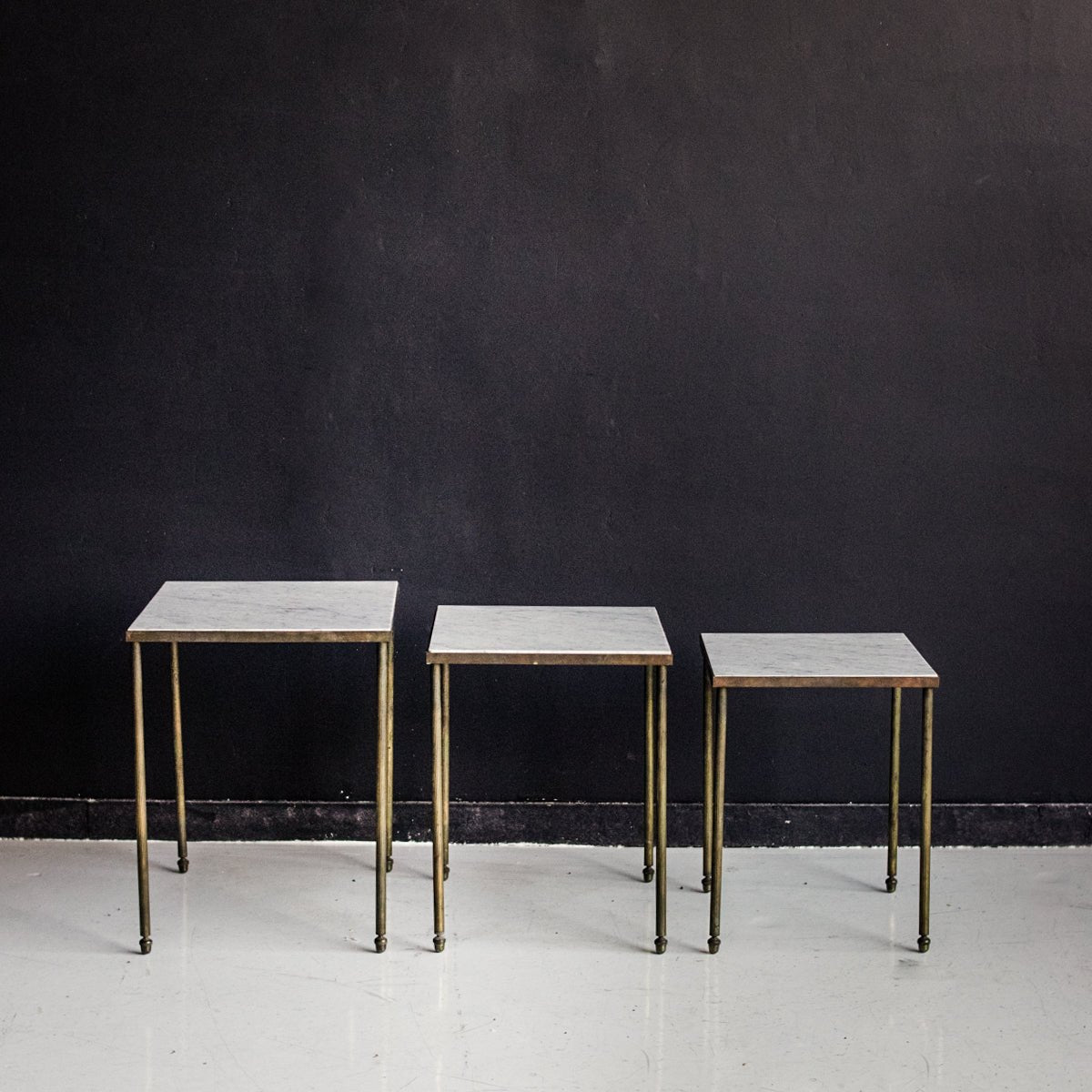 Discovered at a flea market in Avignon, this curated trio of nesting tables brings authentic vintage character to any room. Each features a warm un-lacquered brass frame paired with elegant marble tops—a timeless combination that ages beautifully. The three graduated sizes nest compactly for flexible styling: use them together as a sculptural grouping or separate them throughout your home.