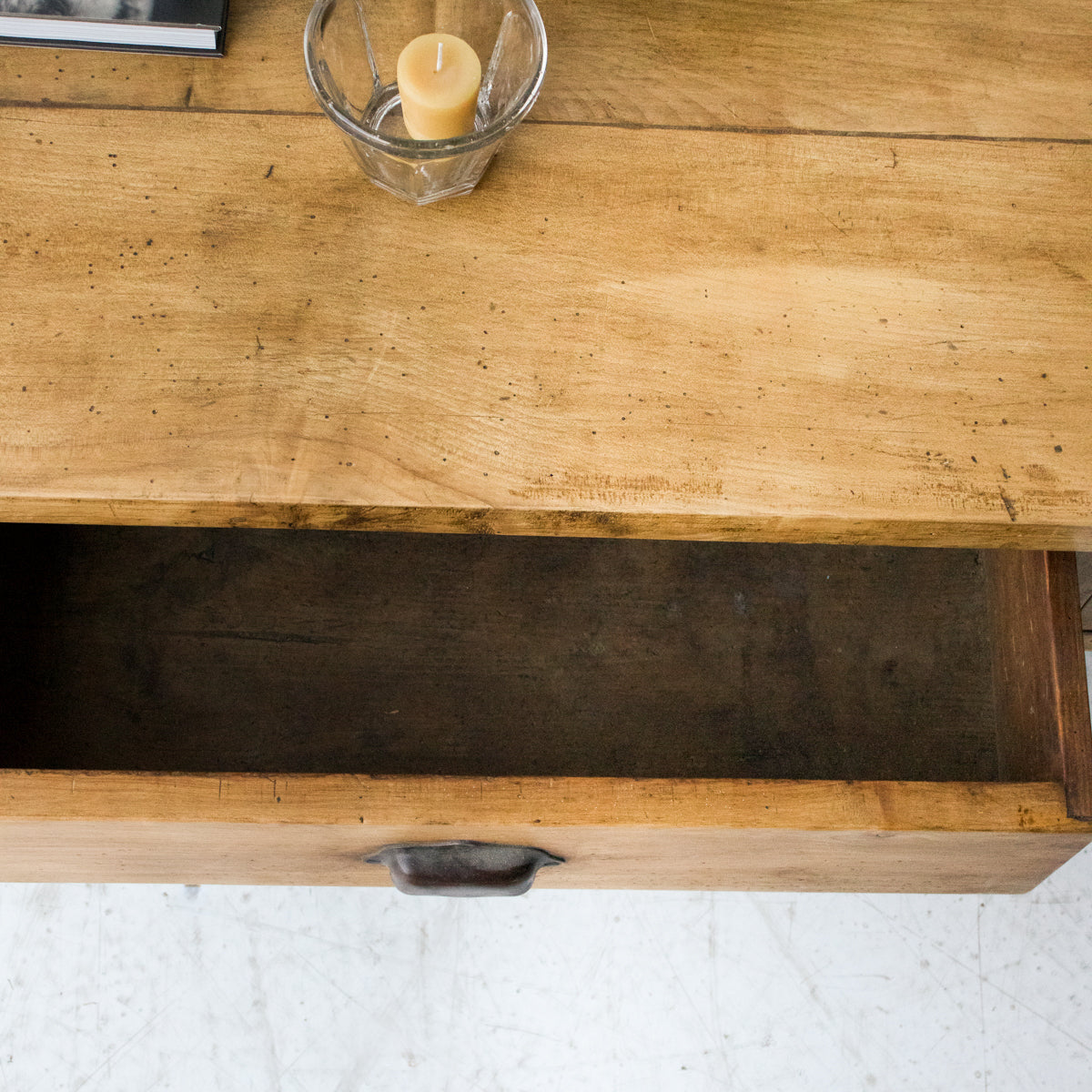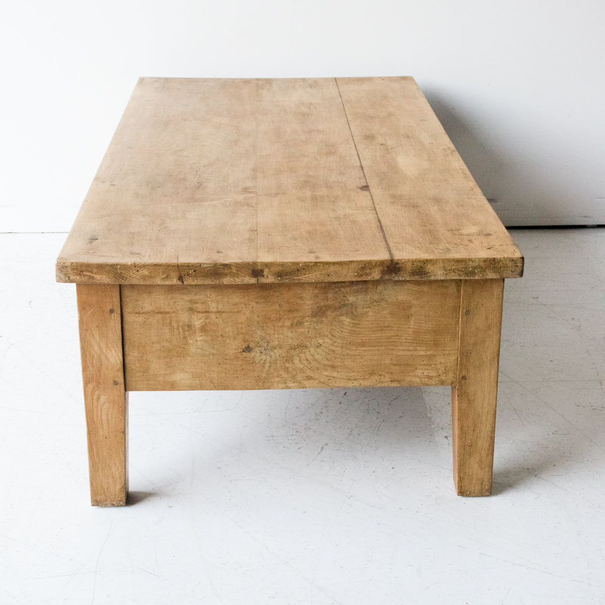 This table was once the centerpiece of a French kitchen. It's been cut down to make a perfectly proportioned coffee table. We love the big drawers and the loved waxed finish, warmed with decades of use.