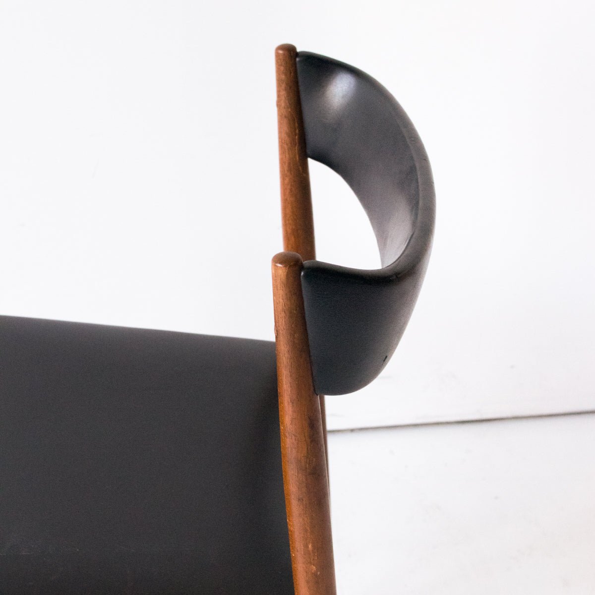 A pair of authentic vintage Scandinavian dining chairs sourced from a Lyon flea market. Each features a sculptural wood frame paired with original black vinyl upholstery on the seat and backrest—hallmarks of mid-century Nordic design. The clean lines and compact proportions make them ideal for intimate dining spaces or as statement accent pieces. Dimensions: 20" W × 18" D × 29.5" H; seat height 17.5" H. Sold as a pair.