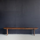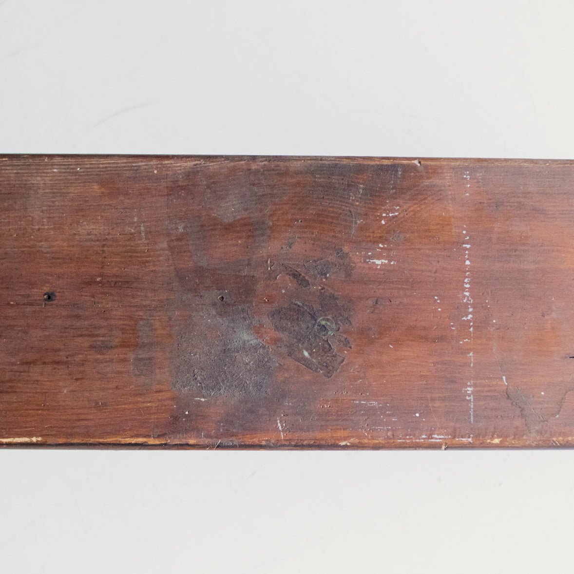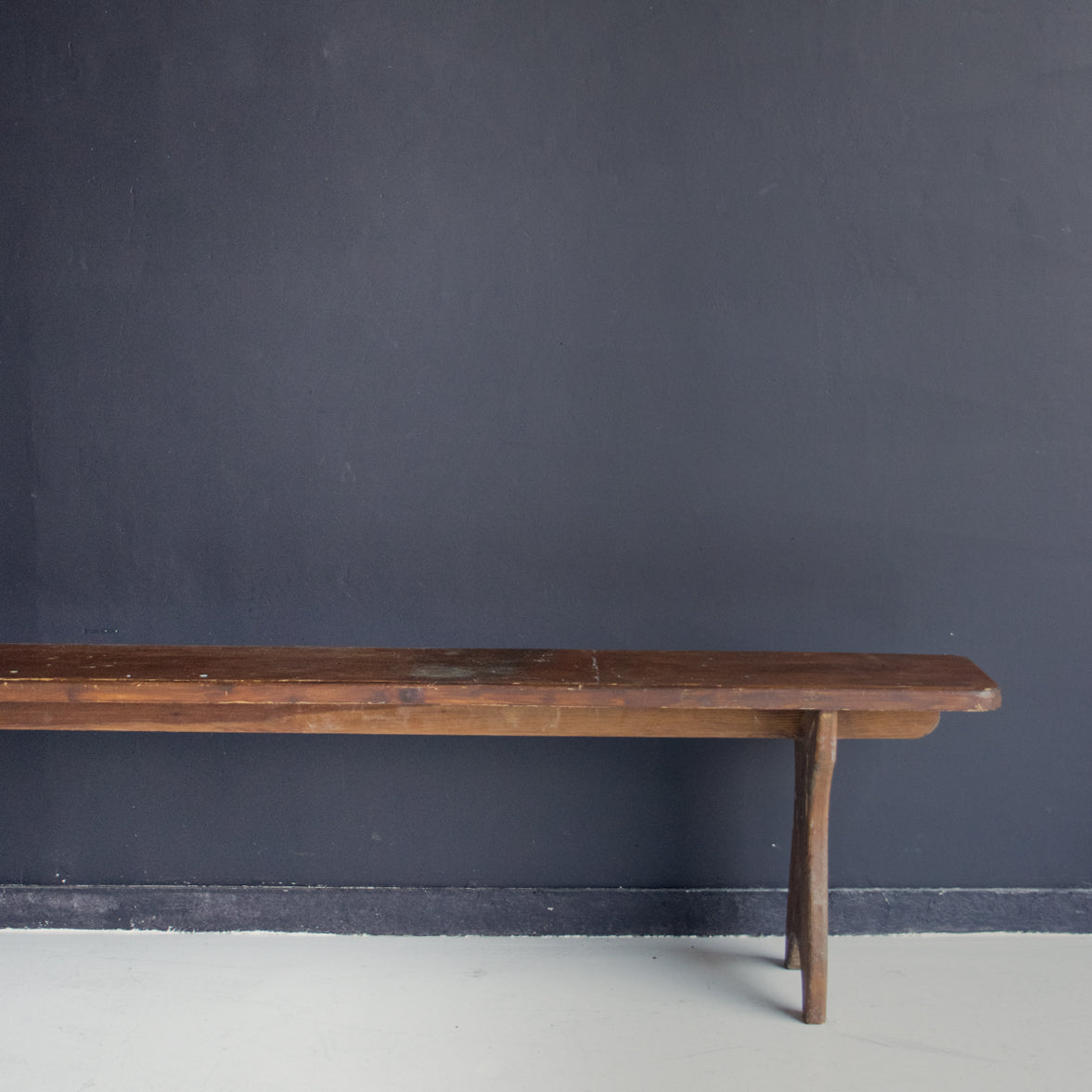 Authentic vintage pair sourced from a Le Mans flea market. Crafted from solid pine with a stained and sealed finish that showcases the wood's natural character and patina. These farm benches carry the understated elegance of European country furniture—ideal for dining, entryways, or as sculptural seating pieces. Each bench reflects its age with subtle wear and authentic detailing. Perfect for collectors seeking genuine vintage finds with provenance and timeless appeal.