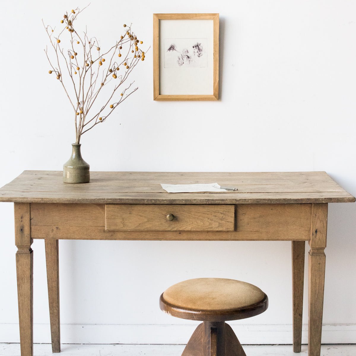 This petite table was once the centerpiece of a French kitchen. The marks of its former life still show on the tabletop. Now we think it's the perfect writing desk or bedside table, since kitchens (and kitchen tables) tend toward the larger in today's homes.