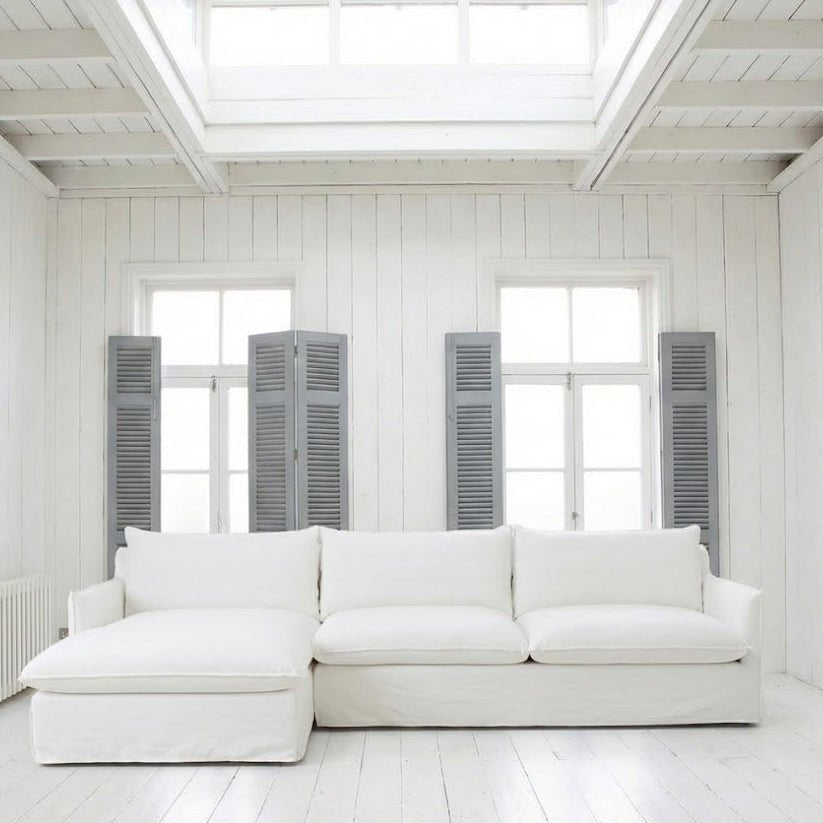 • Upholstered with 100% cotton muslin, then slipcovered with your choice of white denim, ticking stripe, cotton canvas , or flax linen