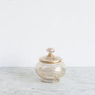 This delicate glass ensemble is known as a goutte de l’eau or verre de nuit, a bedside service traditionally used in France for the evening ritual of taking a medicinal remedy. The set includes a carafe, drinking glass, lidded jar, and matching tray, all adorned with fine gilt banding that catches the light with quiet elegance.