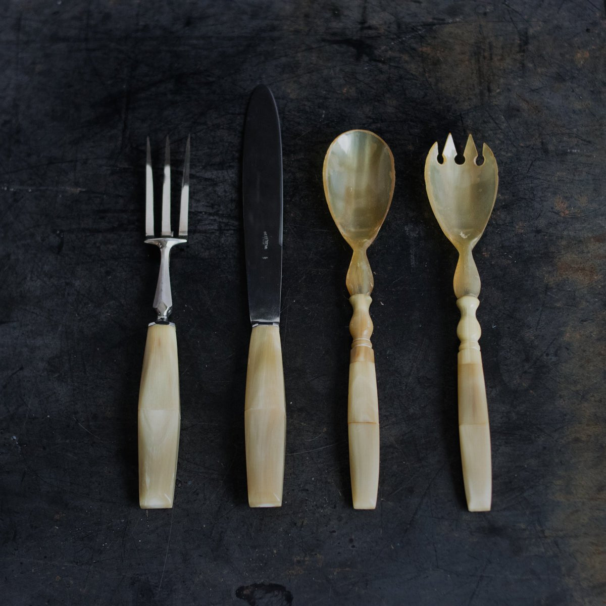 A curated four-piece serving set sourced from a flea market in Paray le Monial, showcasing authentic vintage craftsmanship. Bone handles anchor the spoon and spork, while horn construction defines these serving pieces. The carving fork and knife feature stainless steel blades paired with bone handles, each stamped with the maker's mark. Serving spork and spoon measure 10.25" in length; carving fork, 10.25"; carving knife, 12.25". A refined addition to any table setting or collection of vintage serving implements.