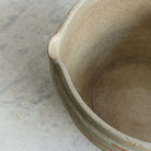 - Glazed interior and rim, bisque exterior.