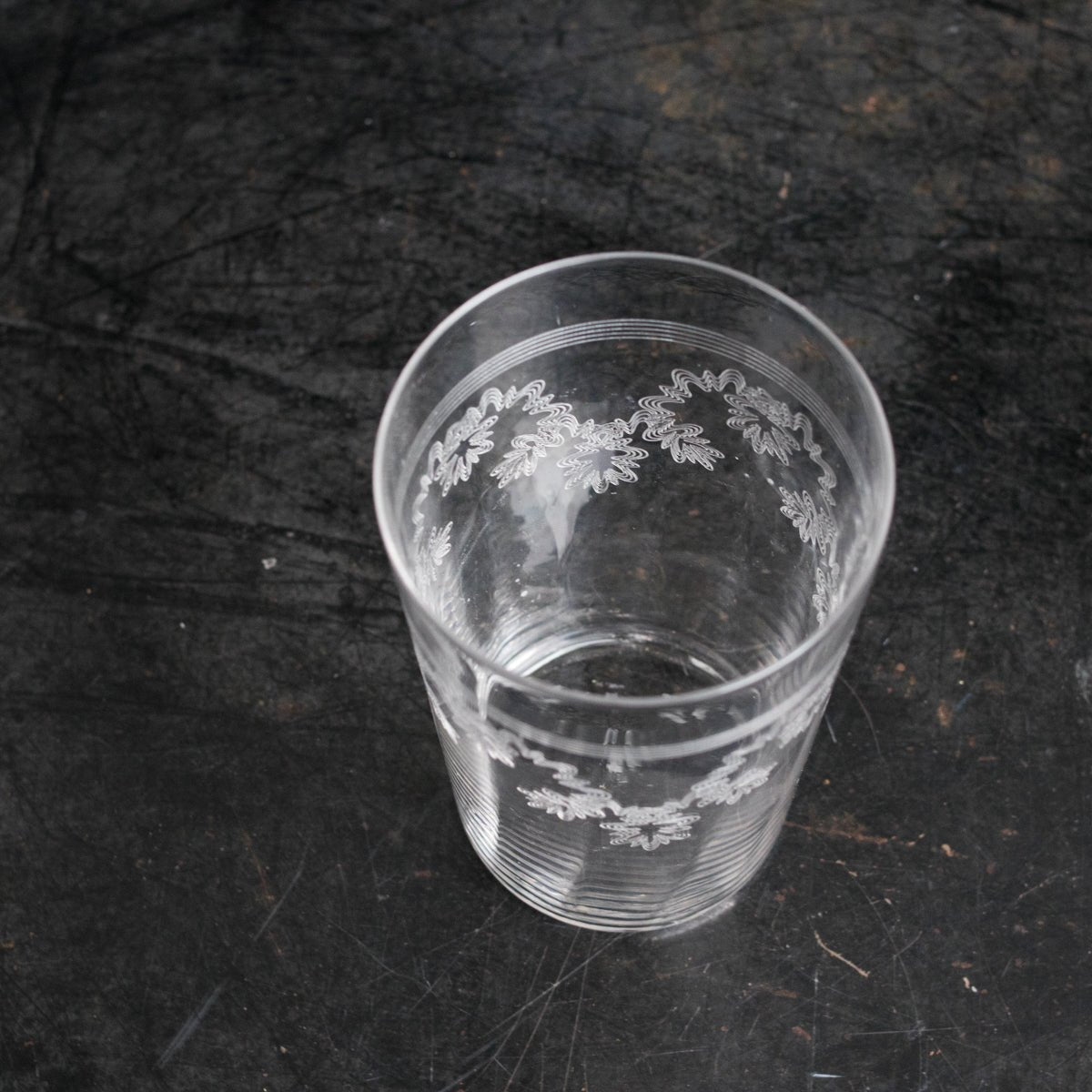 Discover this charming vintage blown glass tumbler, sourced from a flea market in Pézenas. Hand-etched with delicate scroll detailing, this French find showcases the craftsmanship of mid-century glasswork. The subtle surface texture and refined proportions make it equally suited for display or everyday use. A distinctive accent piece for collectors of authentic European vintage glass.