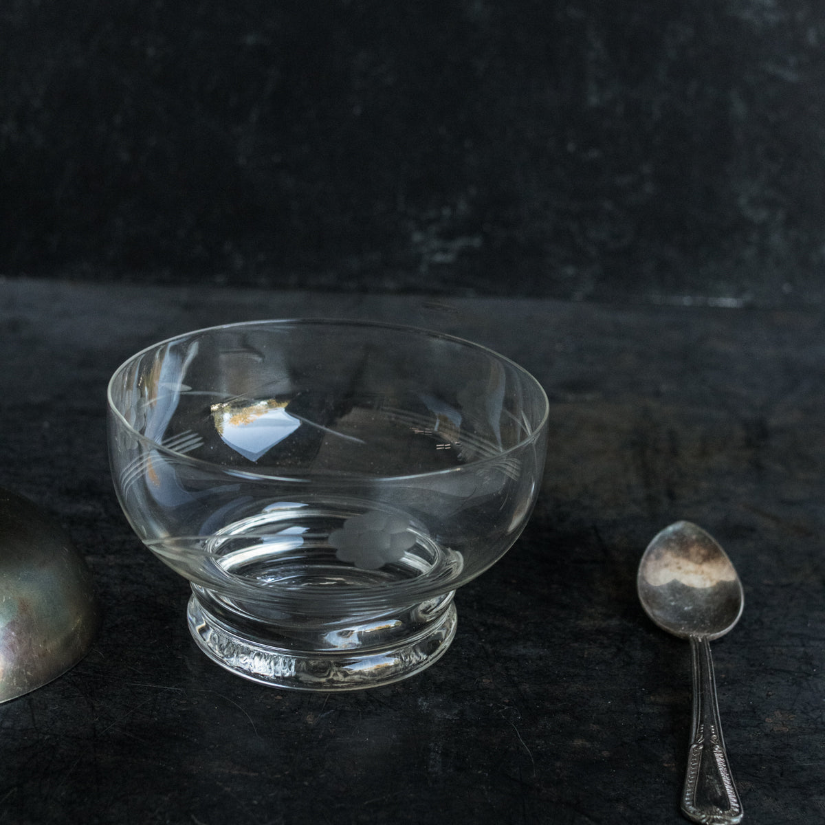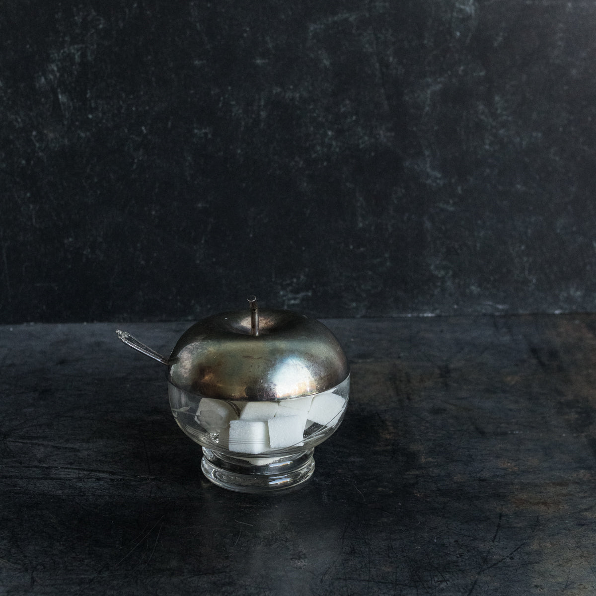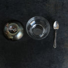 Introducing the Silver Apple Jam Pot, a charming find from a flea market in Alsace. This exquisite piece features a silver-plated top and a hand-engraved glass base, exuding timeless elegance. Accompanied by a silver-plated demitasse spoon, this set includes the beautifully engraved bowl, silver top, and spoon as shown. Perfect for adding a touch of sophistication to your table setting.
