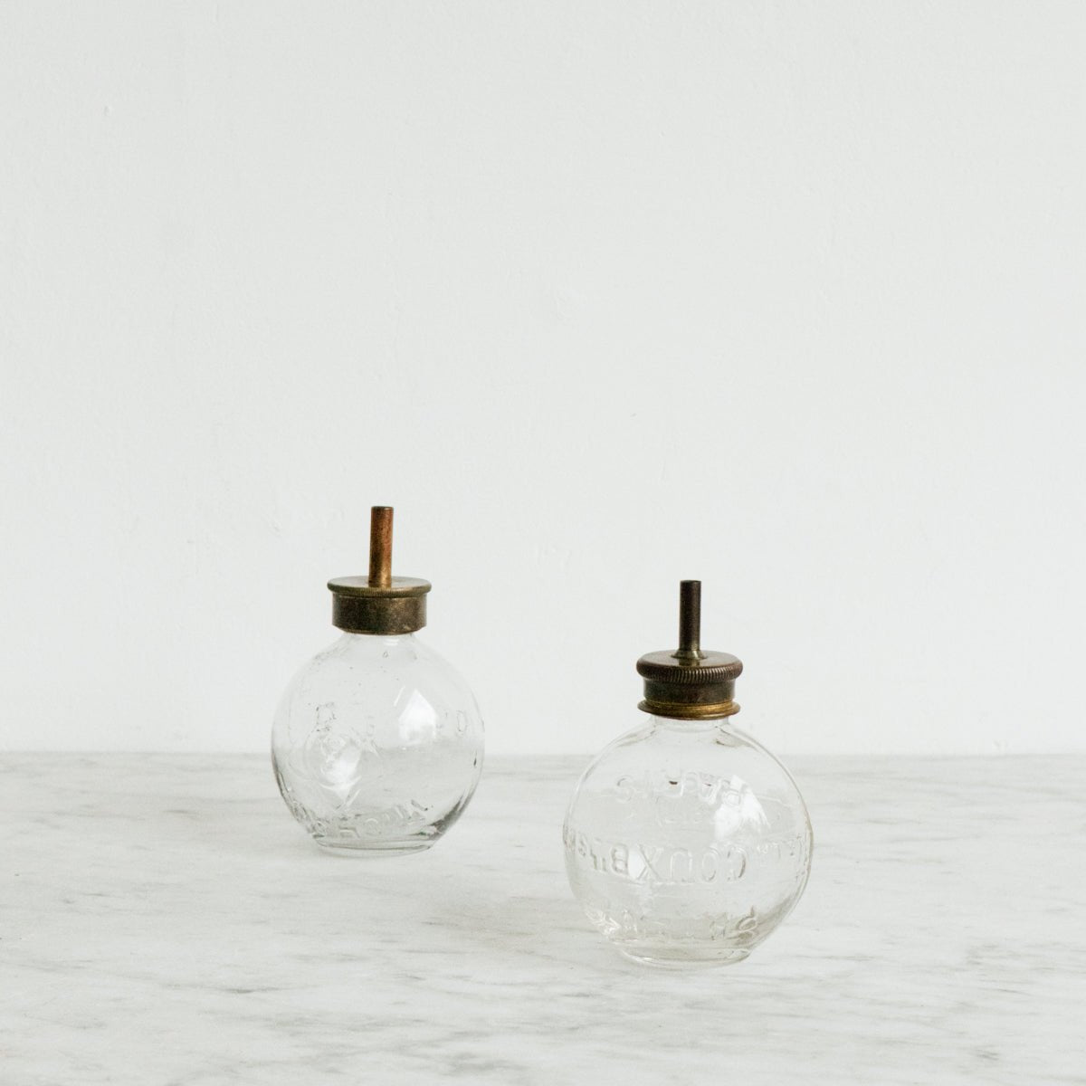 This type of bottle is the perfect blend of form and function. It was originally designed for very delicate lubricating work on machine parts. When inverted, the bottle distributed a single drop of mineral or machine oil. Now it's a lovely relic of a time gone by when that type of work was done entirely by hand. Use it to hold your incense, or simply to admire as part of a collection.