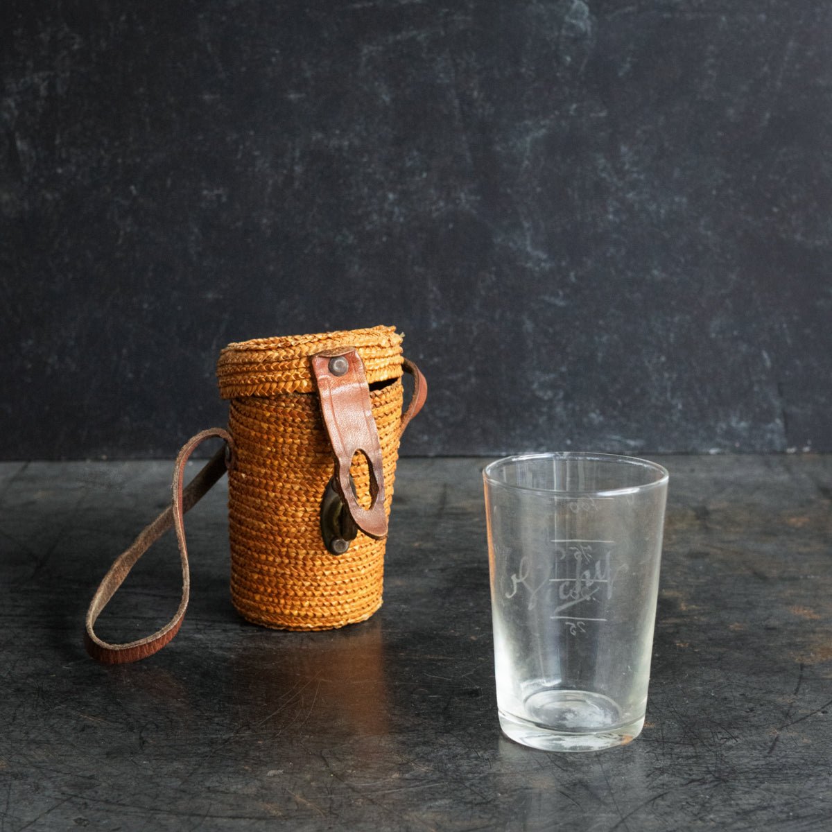 Each Vichy glass was designed for practical ritual and elegance—typically small, straight-sided, and etched with the name of a specific spring or the Vichy Célestins mark, referring to one of the most famous thermal sources. Some examples, like the one shown here, were paired with woven travel cases or leather-handled carriers, allowing spa guests to carry their glass from spring to spring throughout the day.