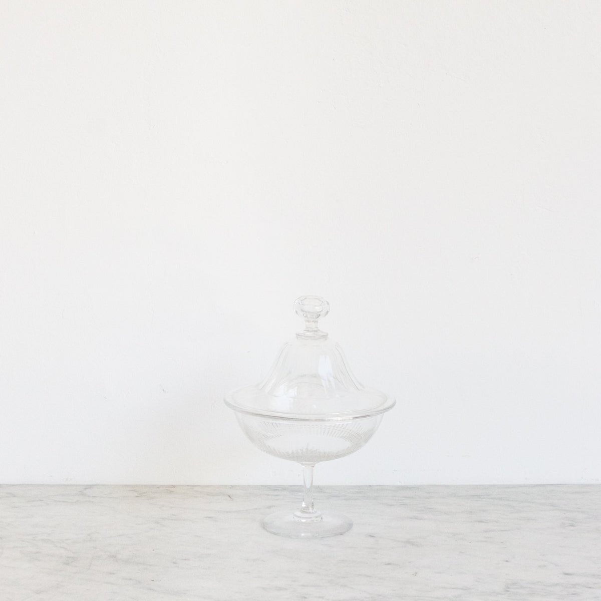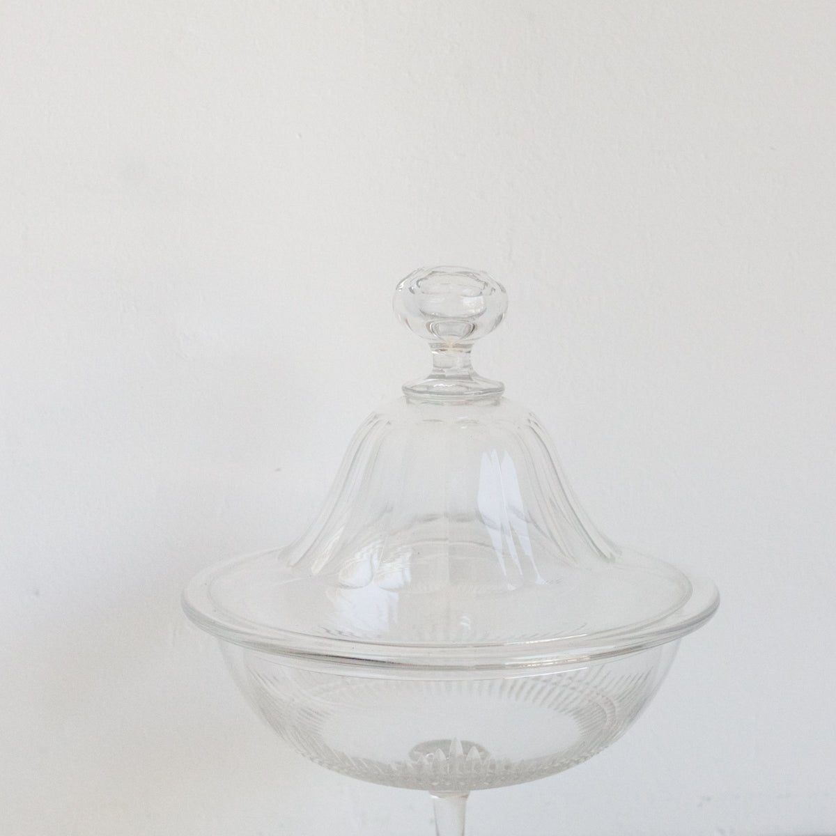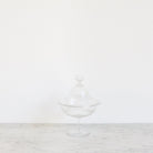 This vintage Cut Glass Candy Jar with Lid, sourced from a flea market in St. Etienne, features finely hand-cut details that highlight its craftsmanship. Made of clear glass, it combines classic design with practical use, ideal for storing sweets or small treasures while adding a touch of timeless elegance to your collection.