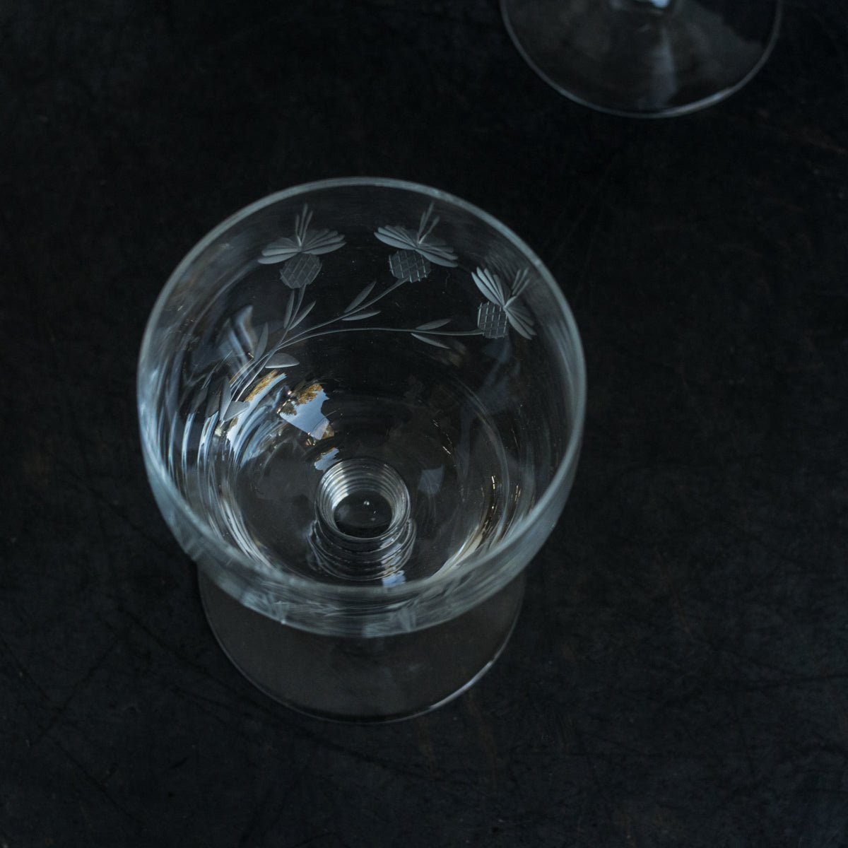 Eached of these petite glasses is a little work of art. Look closer and you'll see tiny strawberries with leaves hand etched on each one.