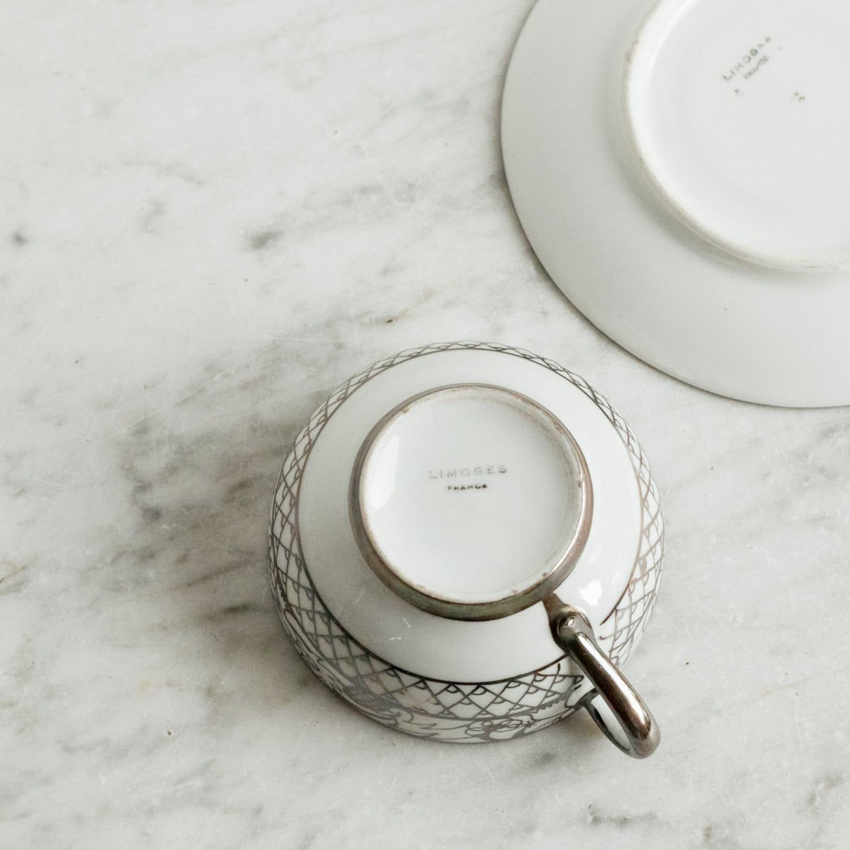 Discover elegance with our Pair of Limoges Porcelain Teacups and Saucers. Unearthed at a charming flea market in Chambord, these exquisite pieces are crafted from fine bone china. Each teacup and saucer is adorned with intricate hand-painted details and proudly bears the maker's mark, a testament to their authenticity and craftsmanship. This listing includes the pair of teacups and matching saucers, perfect for elevating your tea experience or as a cherished addition to your collection.