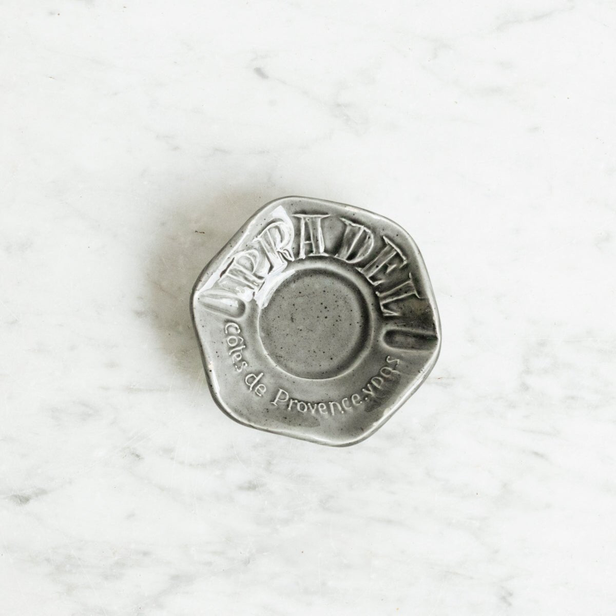 This lovely ceramic piece is a relic of a time gone by when every tasting room had ashtrays on the tables advertising certain products. This example advertises the Provencal winery Pradel.