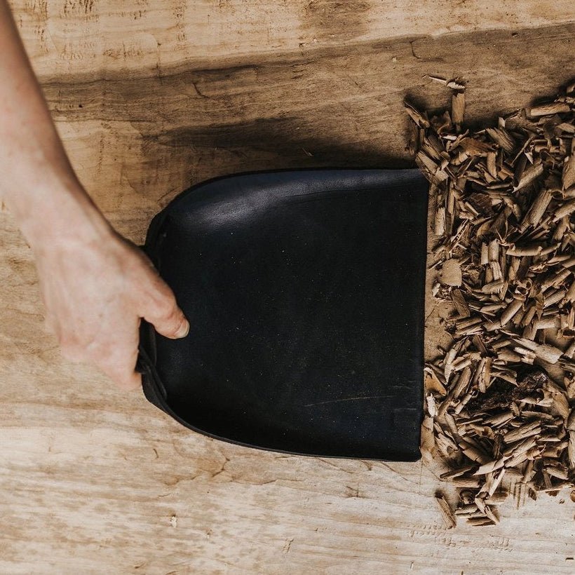 - Dustpan is made of folded leather. Naturally dyed and finished. Leather hanging loop.