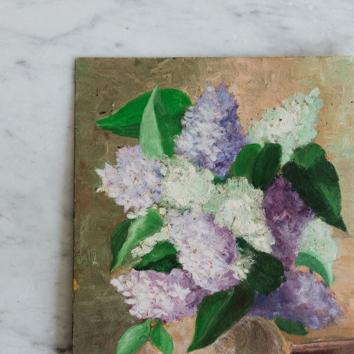 • Still life with citrus on one side and floral still life with lilacs on the other.