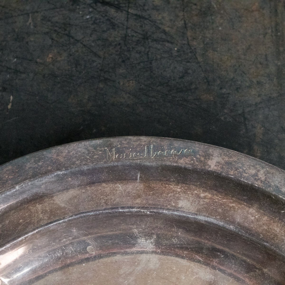Discover this exquisite vintage silver-plated brass tray, hand-engraved with "Marie-Therese"—a timeless piece sourced from a flea market in Ardèche, France. Measuring 6.75" × 6.75" × 0.75", its compact proportions make it ideal for displaying jewelry, holding catchall items on a dresser, or serving as a refined accent on a bookshelf. The delicate engraving and lustrous silver plating showcase the craftsmanship of an earlier era, adding authentic character and patina to any curated collection.