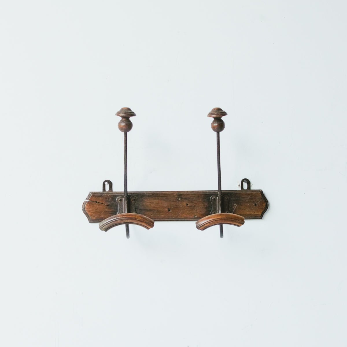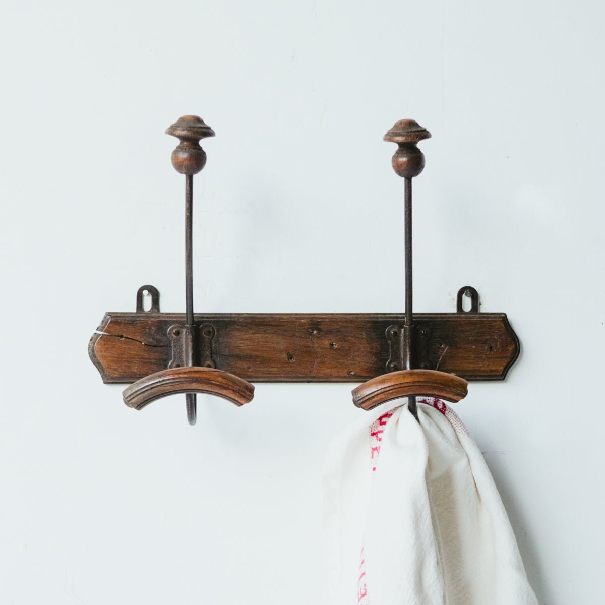 Authentic vintage coat rack sourced from a flea market in Avignon, France. Crafted from wood with wood and zinc hooks, this piece carries the patina and character of genuine age. Measuring 15.75"w × 10.75"h with a 5.5" projection, it functions as both practical storage and a curated accent for entryways or bedrooms. The zinc hardware develops a natural patina over time, adding to its vintage appeal.