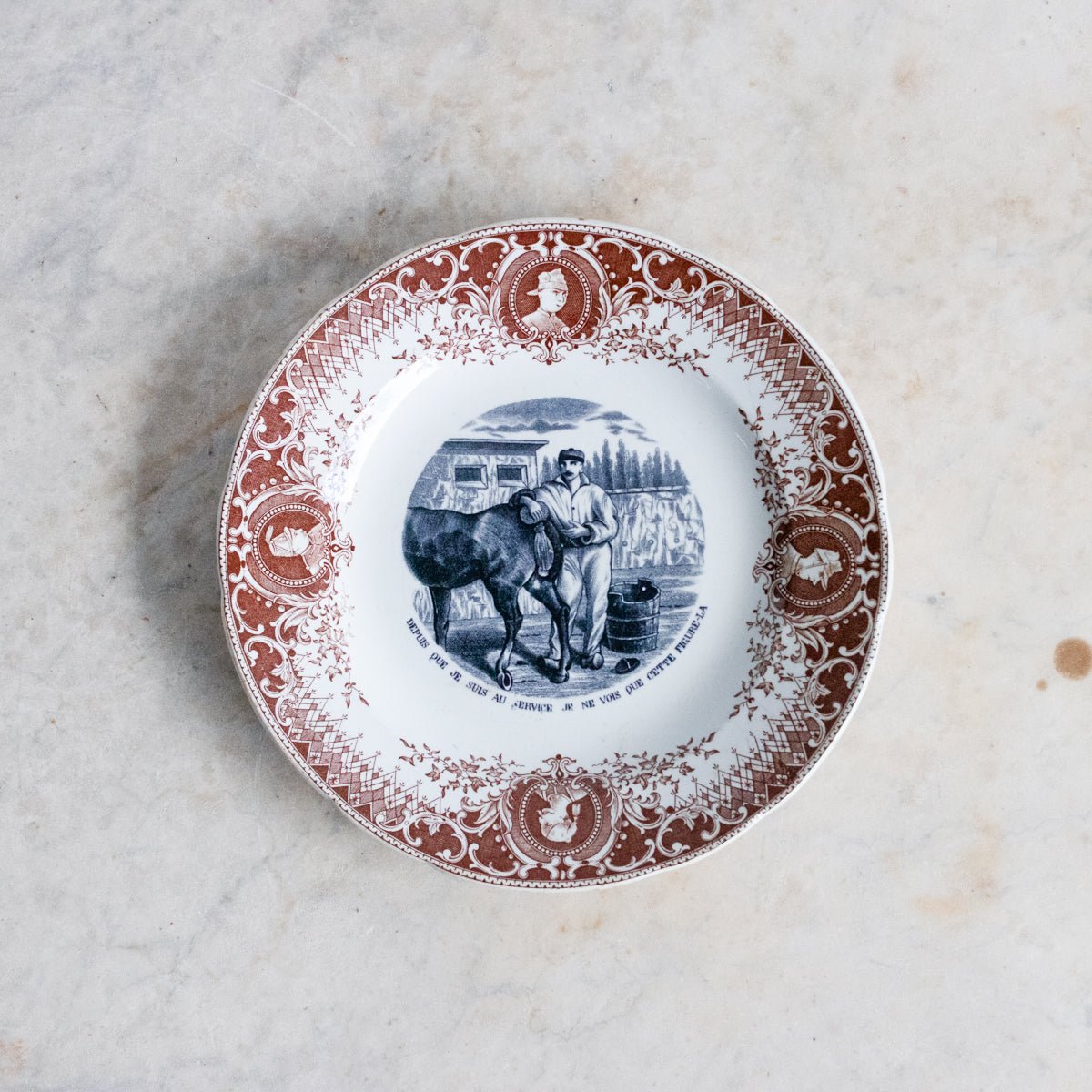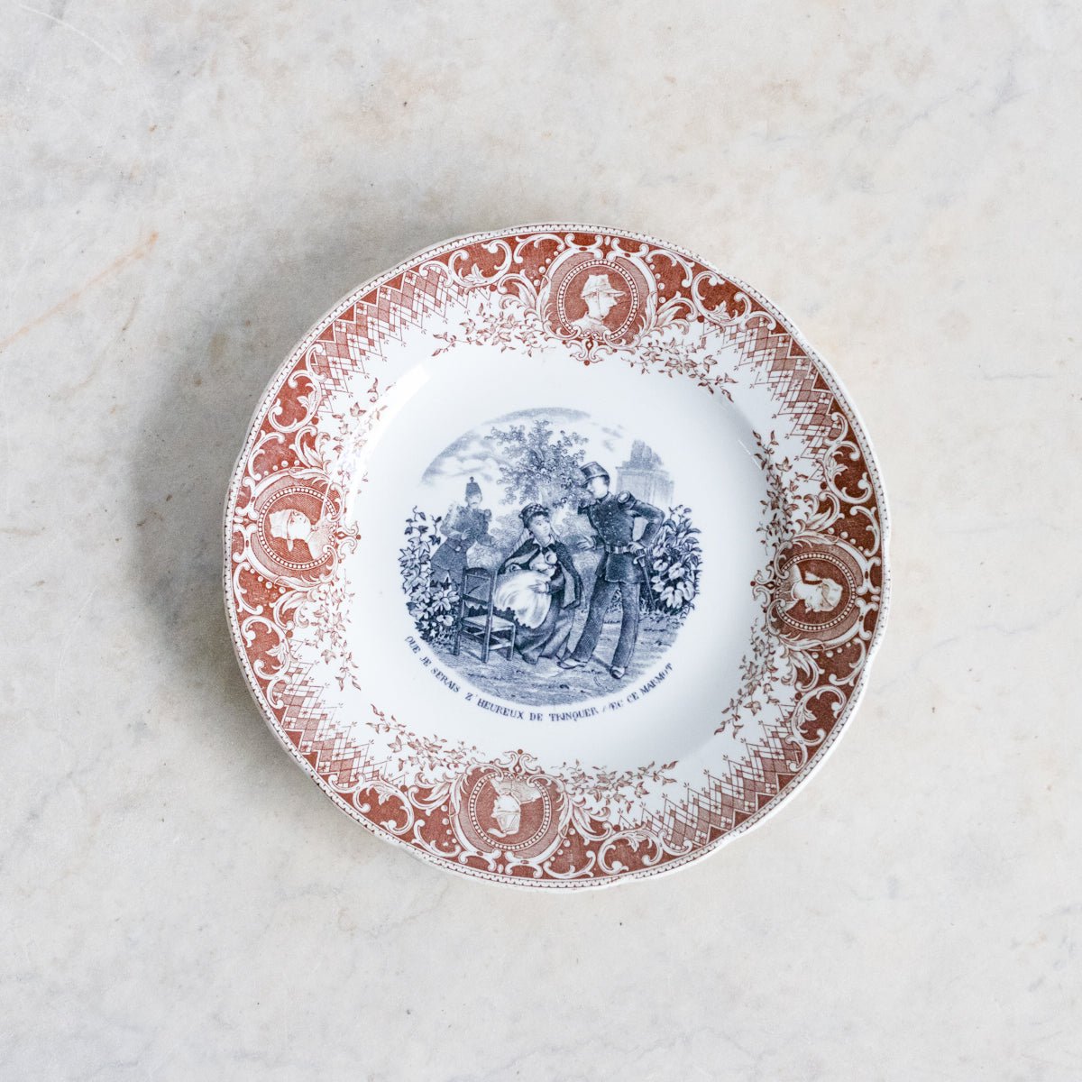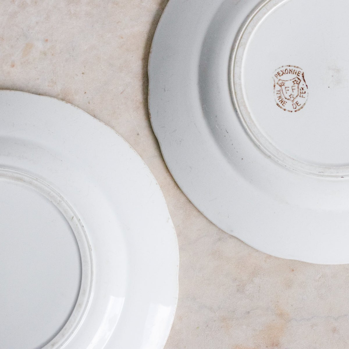 Introducing the Antique Conversation Plate Set of 4, a charming collection discovered in a quaint flea market in Pezenas. Crafted from durable ironstone, this set features two plates stamped with authentic maker's marks, adding a touch of history to your table. With one pattern beautifully duplicated, these plates are perfect for sparking conversation and adding a vintage flair to any dining experience.
