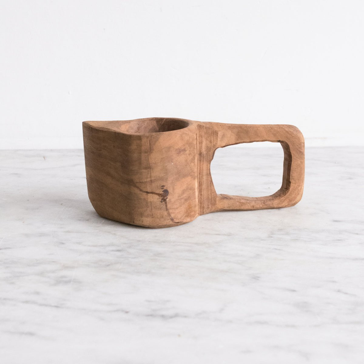 A hand-carved wooden grain scoop, carved from a single block of wood and featuring a deep cylindrical bowl with an open rectangular handle. Designed for everyday use, this utilitarian object would have traditionally been used for scooping flour, grain, or other dry goods in a rural kitchen or bakery setting. The simple, architectural form emphasizes function and craftsmanship, while the worn surface and subtle tool marks speak to its history of use. Today, it stands equally well as a sculptural object or decorative accent, embodying the quiet beauty of vernacular folk design.