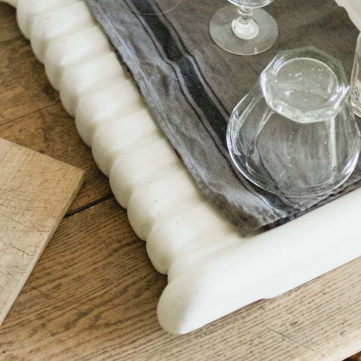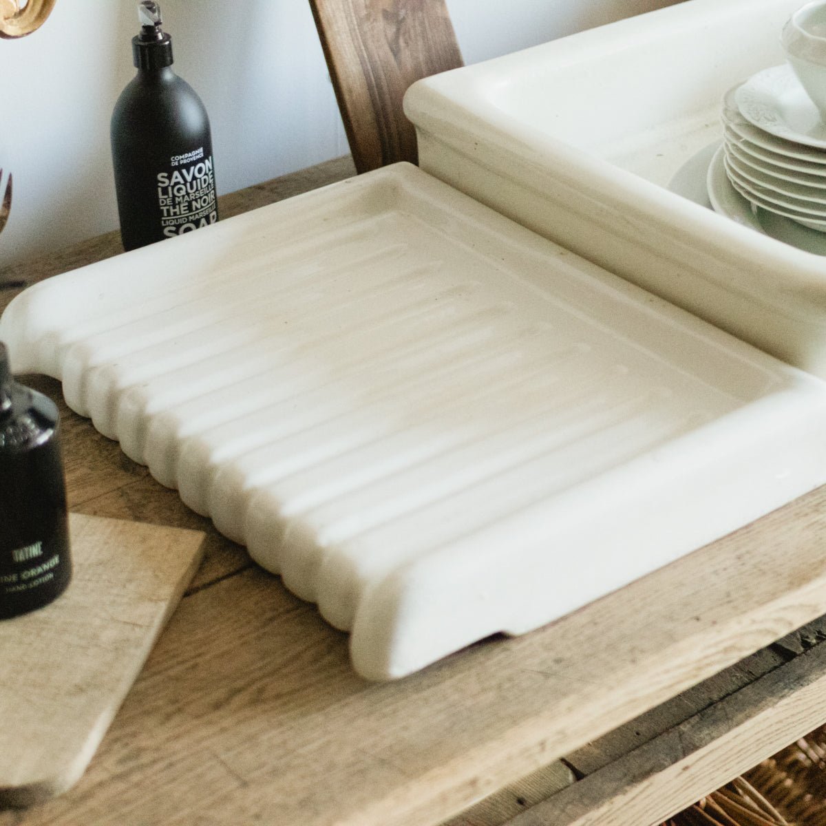 A rare and beautifully sculptural French porcelain sink drainboard dating to the late 19th or early 20th century. Originally designed as a built-in kitchen or scullery element, the softly fluted surface allowed water to drain neatly back into the sink, while the raised edges protected surrounding cabinetry. Mold-cast in thick white porcelain with a smooth, timeworn glaze, this piece reflects the quiet elegance and practicality of French provincial domestic design. Subtle wear, patina, and small imperfections attest to its long working life and add to its authentic character. Today, it makes a striking decorative object—perfect as a soap tray, kitchen accent, or sculptural display in both rustic and modern interiors.