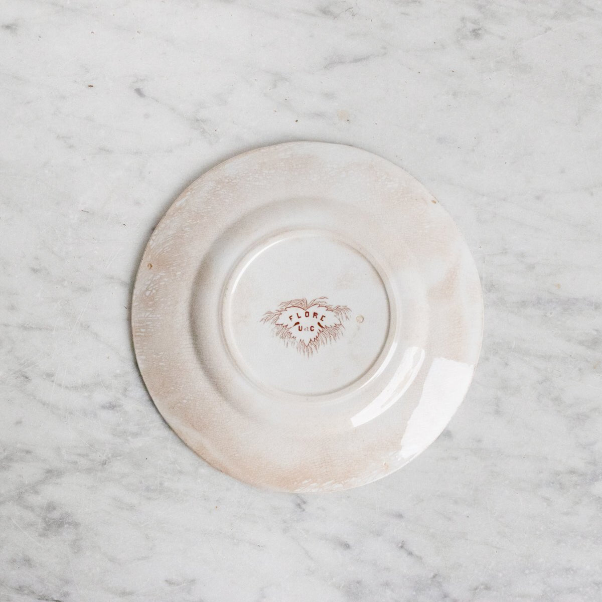 Introducing the Flore Transferware Plate Set of 5, a timeless collection discovered in a charming flea market in Lyon. Crafted from durable ironstone, each plate is stamped with the maker's mark, ensuring authenticity and heritage. The natural darkening, or "buttering," adds a unique vintage charm, making this set a perfect addition to any table setting.