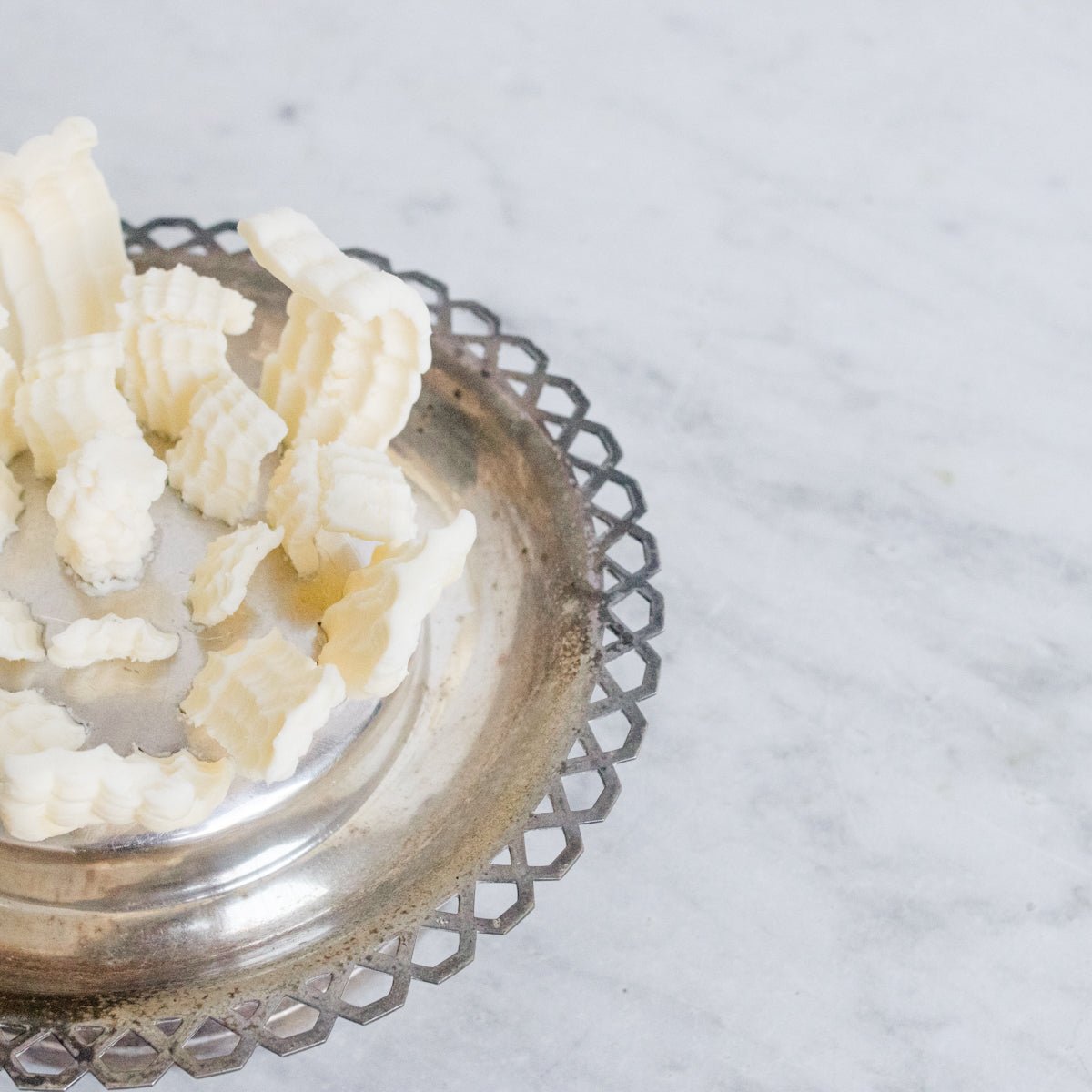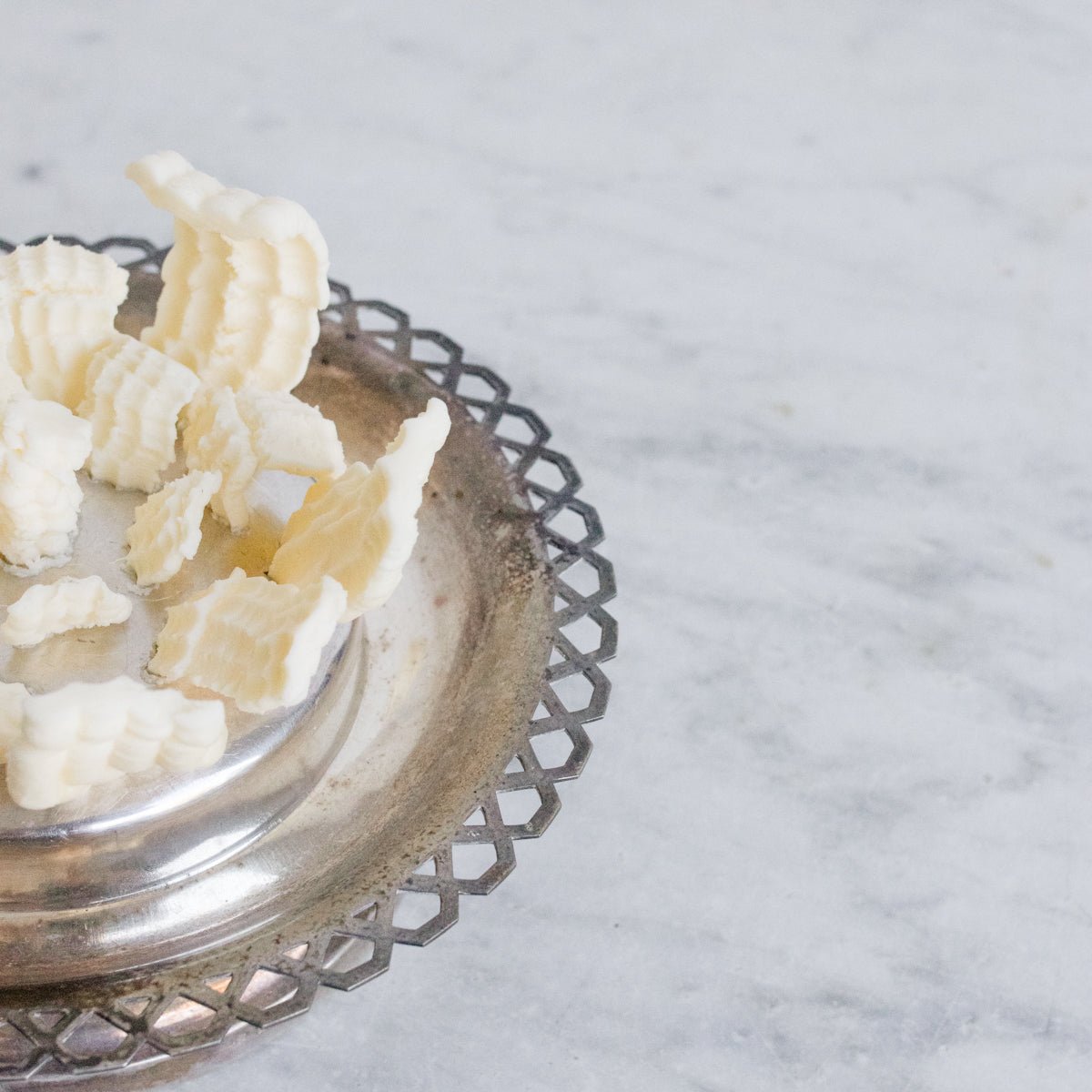 This tool is a classic in a French hotel. Butter is packed into the reservoir, then when the top is pressed down, lovely curls emerge.