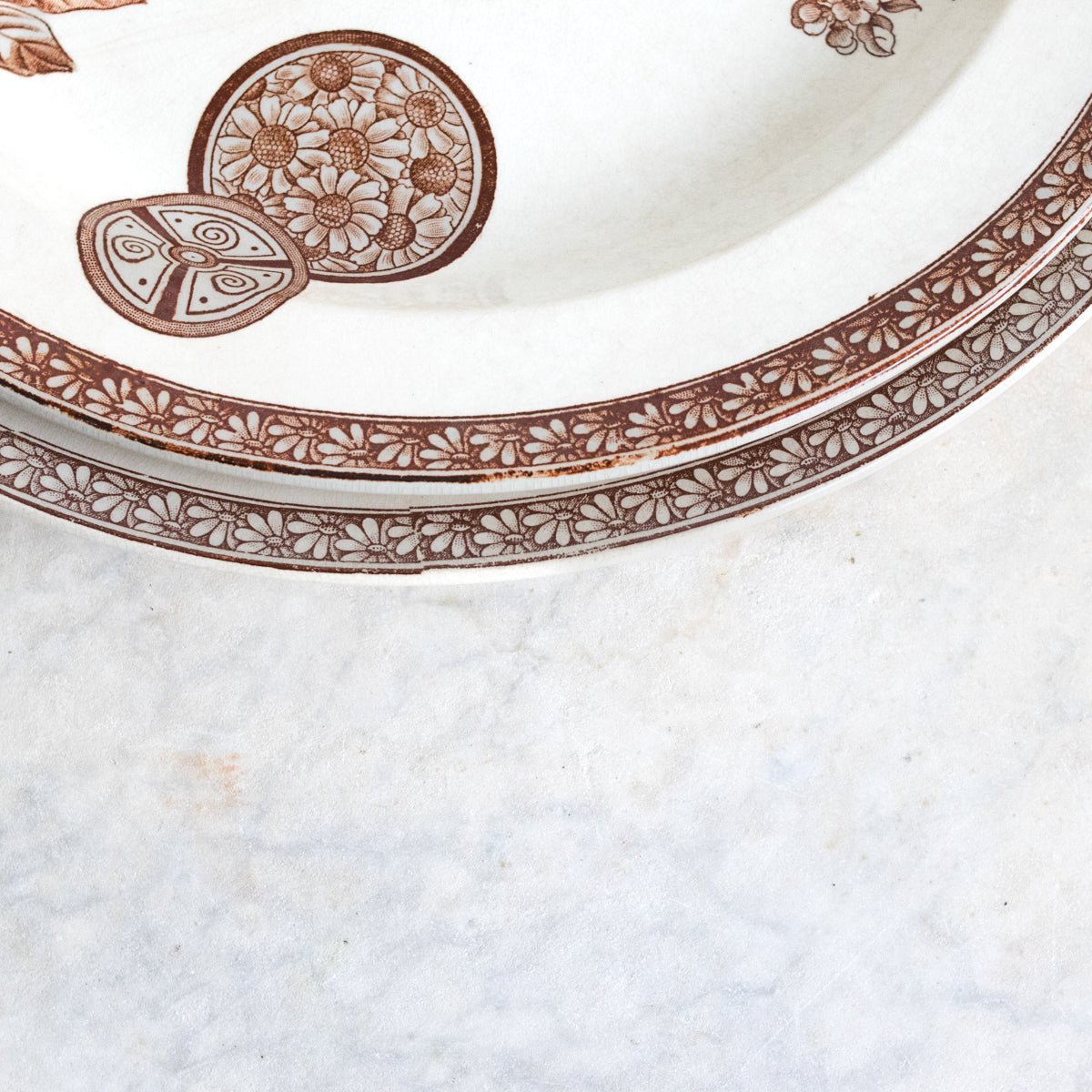 Introducing the Pair of Succursale Transfeware Platters, a unique find from a charming flea market in Lyon. Crafted from durable ironstone, each platter is stamped with the maker's mark, ensuring authenticity and timeless appeal. This listing includes the exquisite pair of platters as shown, perfect for adding a touch of vintage elegance to your dining experience.