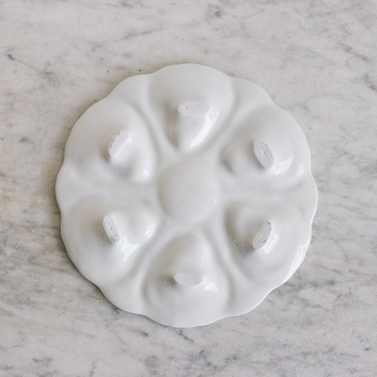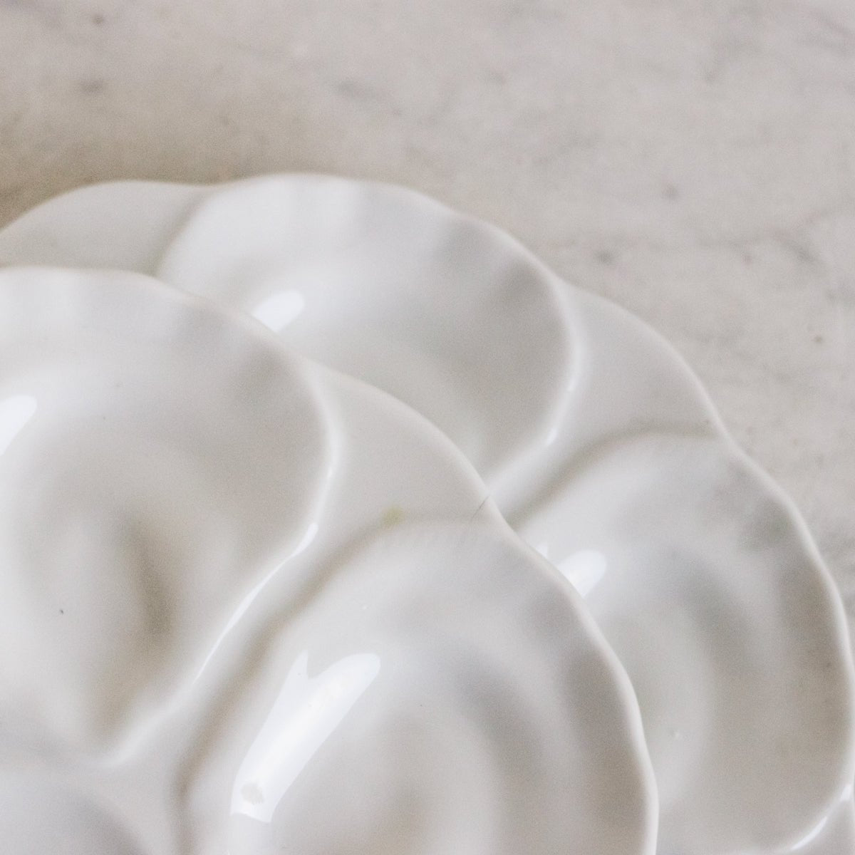 The French oyster plate is a special luxury. We love the beautifully detailed majolica design of oyster shells radiating around a center medallion.