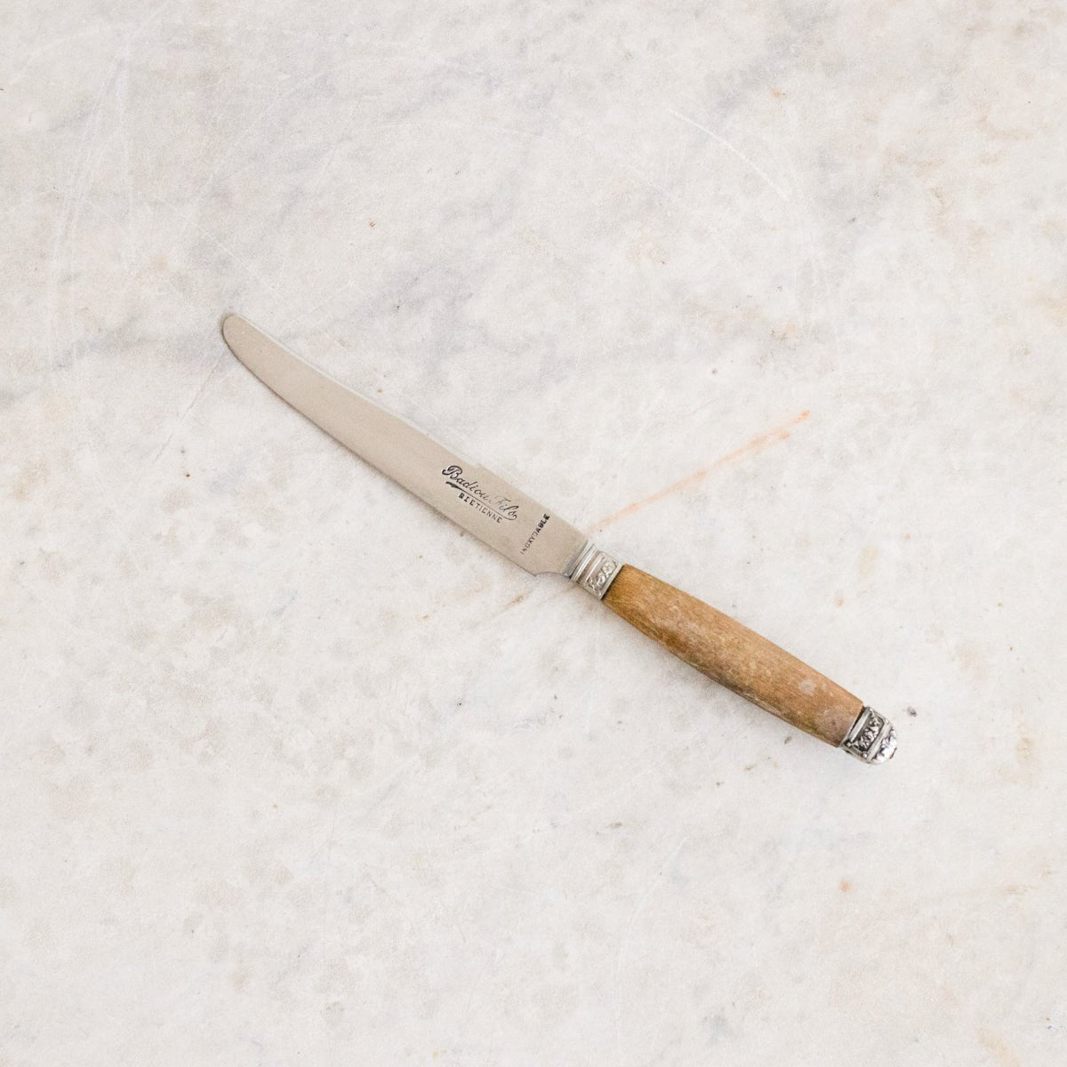 Introducing the Stamped Horn Knife Set of 9 – a unique collection discovered in a charming flea market in Alsace. Each knife features a beautifully crafted horn handle and durable stainless steel blades, ensuring both elegance and functionality. The blades are stamped with the maker's mark, adding a touch of authenticity and history to your kitchen. This set includes all 9 knives shown, perfect for enhancing your culinary experience.