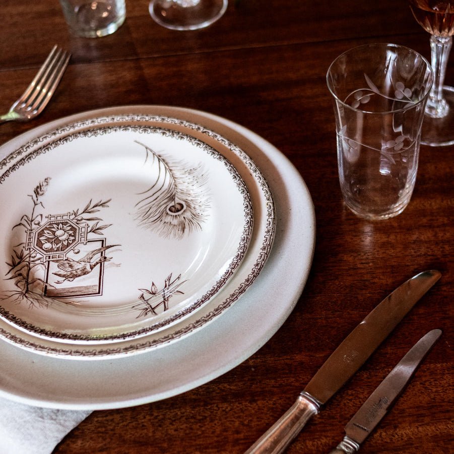 Discover the charm of the past with this exquisite set of eight ironstone plates, each adorned with intricate bird and feather motifs. Unearthed from a flea market in Ardeche, these plates are stamped with the maker's mark, ensuring authenticity and timeless elegance. Perfect for collectors and those who appreciate unique, vintage tableware.