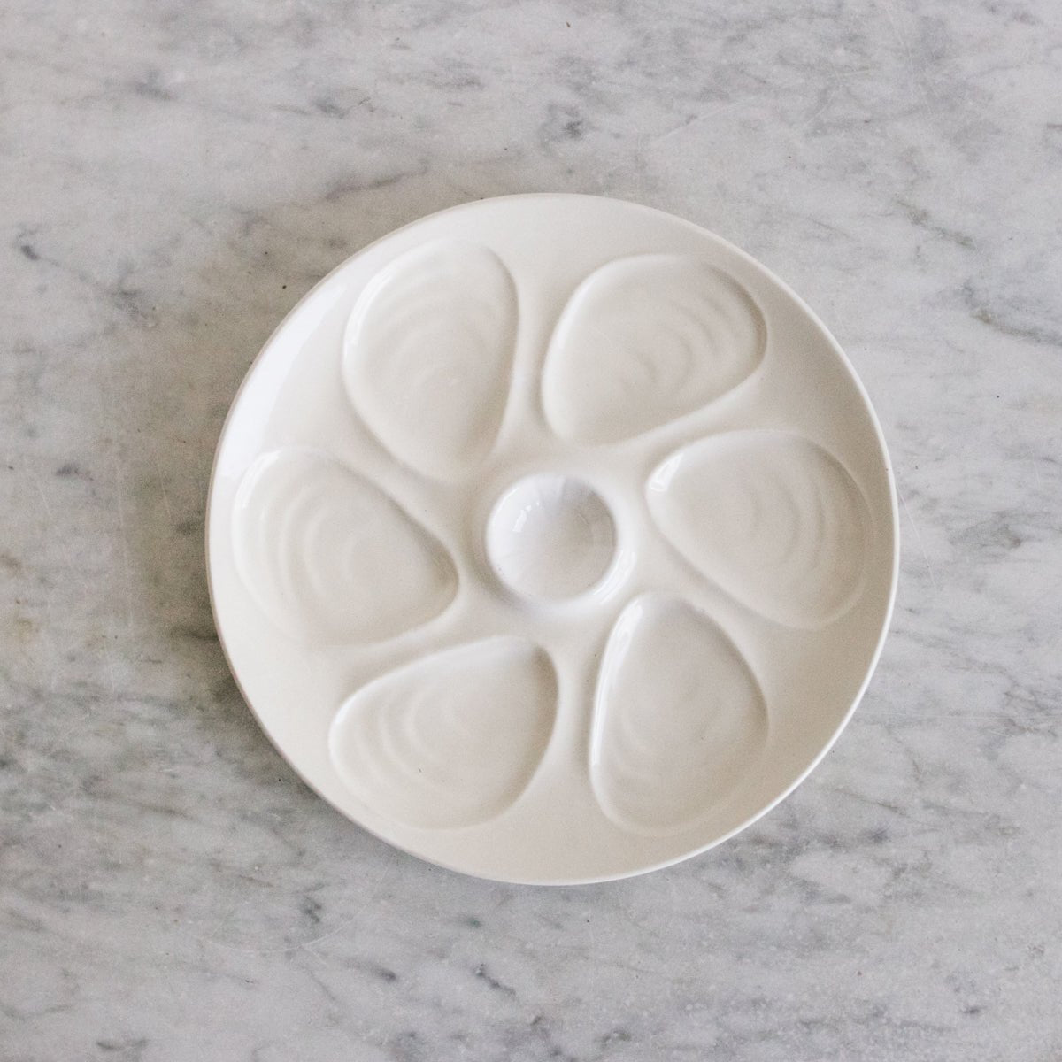 The French oyster plate is a special luxury. We love the beautifully detailed majolica design of oyster shells radiating around a center medallion.