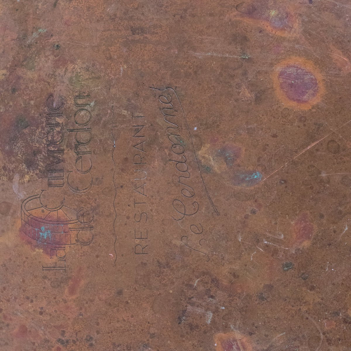 The pan is fitted with a substantial riveted brass handle and robust hinge hardware, all characteristic of serious French restaurant cookware. The underside is engraved with the name “Le Cerdonne,” indicating restaurant ownership and confirming its use in a professional culinary setting rather than domestic production.