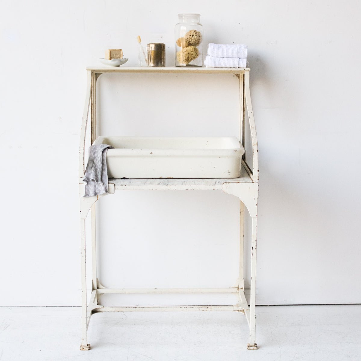 This lovely counter was once used in a Paris bank. Each bank teller had her own marble counter like this one, and the upper frame was fitted with pebbled glass. The glass is long gone, and now the frame supports a graceful shelf. We think it's a perfect very special piece to be fitted with a sink for a powder room or mud room.