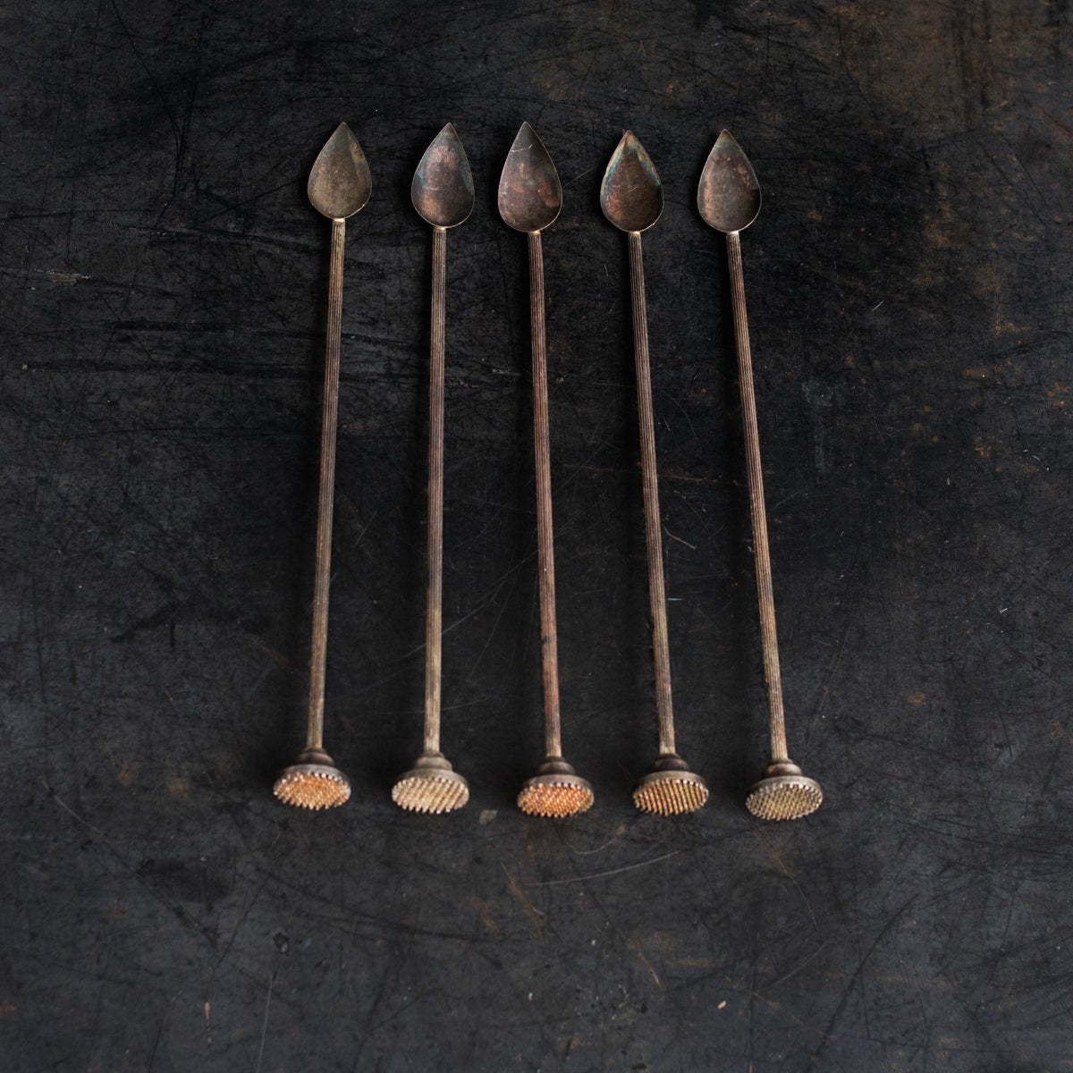 Discover this authentic vintage bar spoon, sourced from a flea market in Chambord. Crafted from brass with silver plating, this dual-purpose tool features a spoon on one end and a muddler on the reverse—essential for craft cocktail preparation. At 9 inches long, it's perfectly weighted for both stirring and crushing ingredients. A genuine piece of barware history that brings both functionality and character to any home bar or collection.