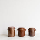 Discover the charm of rustic elegance with our Trio of Stoneware Crocks with Lids in Brown. Unearthed from a quaint flea market in Alsace, these stoneware treasures bring a touch of history to your home. The set includes three beautifully crafted crocks, each with its own lid, perfect for storing kitchen essentials or adding a decorative touch to any space. Please note, minor imperfections add to their unique character, as shown in the images.