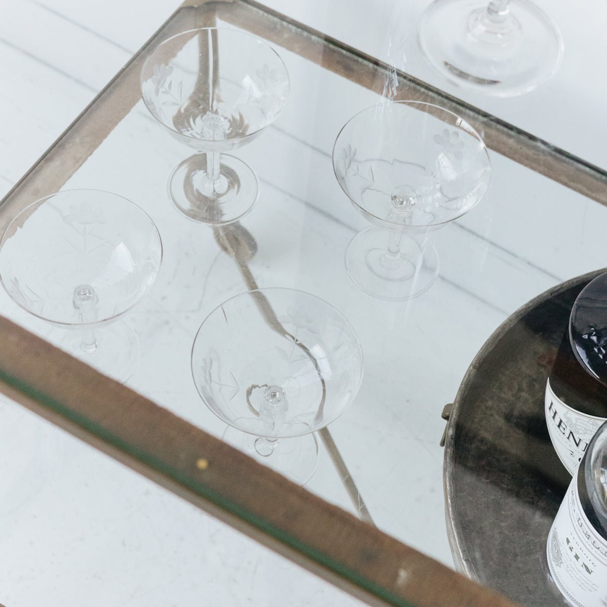 vintage glassware : vintage champagne coupes and flutes for toasting, vintage wine glasses, lovely moroccan tea glasses and unique vintage bar glasses and decanters