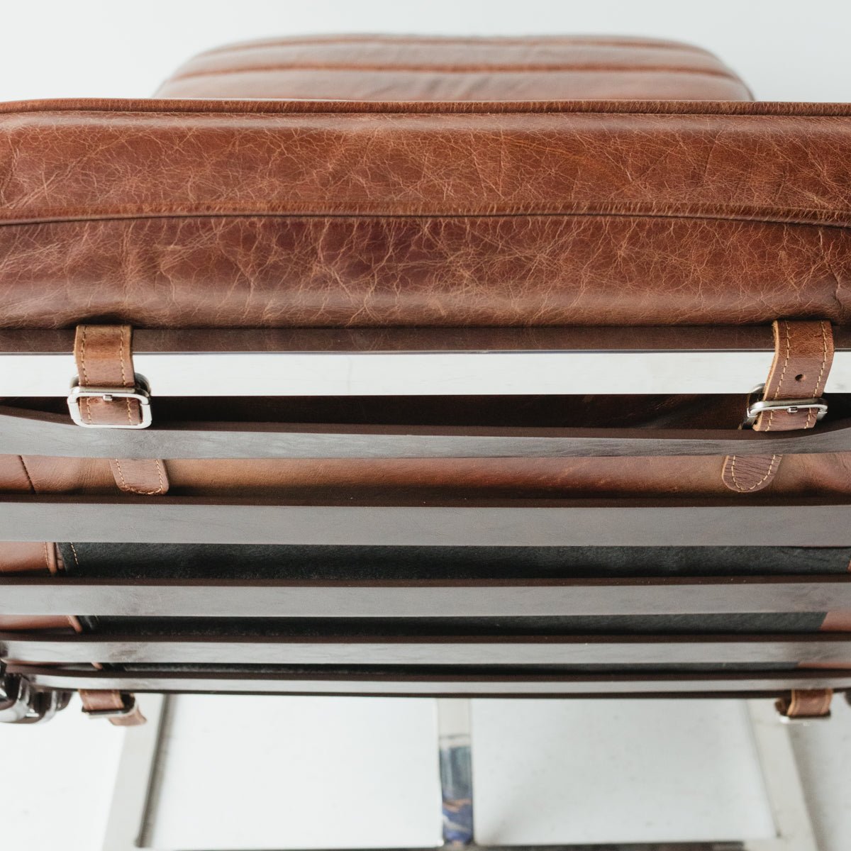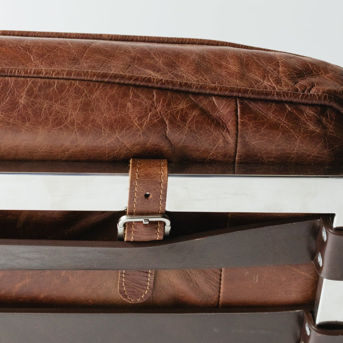 Deep horizontal channel tufting enhances both comfort and visual impact, offering an enveloping seat that invites relaxation while showcasing meticulous craftsmanship. The marriage of warm, supple leather with cool, polished chrome results in a timeless aesthetic—chic, sleek, and undeniably sophisticated.