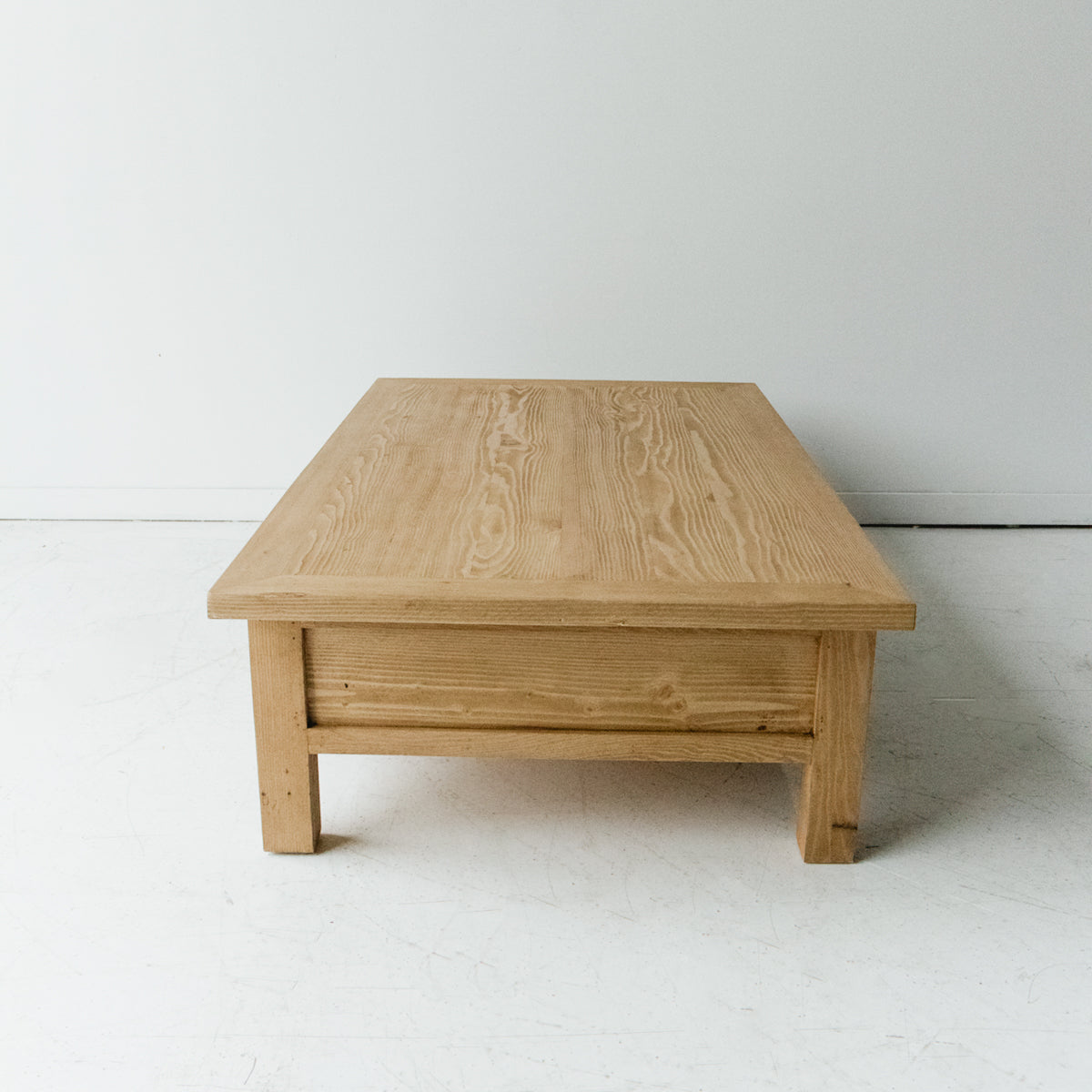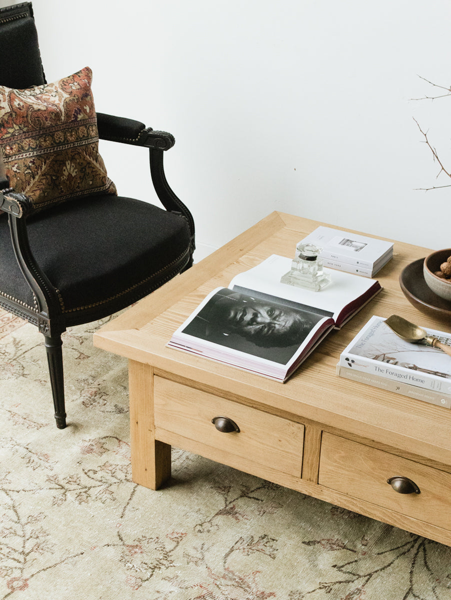 This coffee table is so chic and simple. It's inspired by the coffee table that Laurie has in her living room which was a vintage work table cut down to coffee table size. The scale is perfection, and the pass-through drawers provide plentiful storage that's nice to have in a coffee table.
